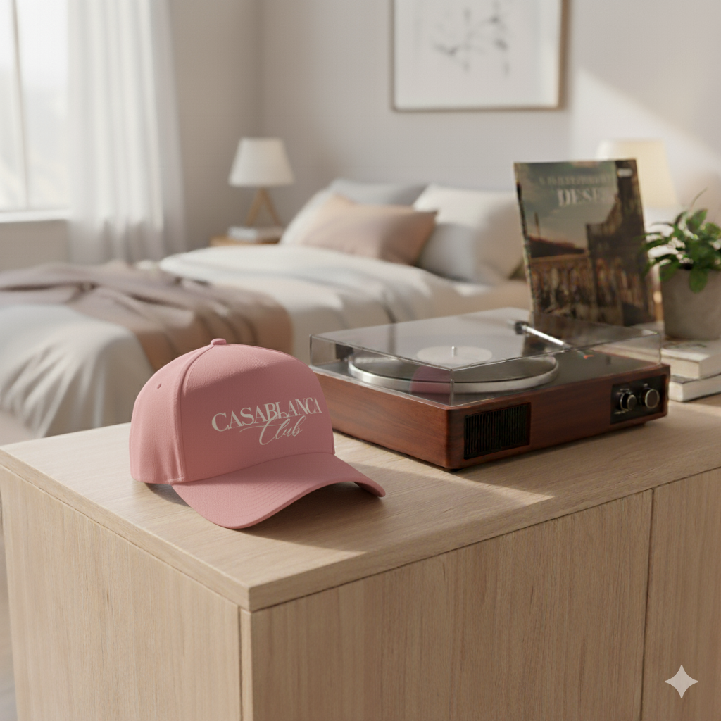 Step into a world of intrigue and exclusivity with the Casablanca Club Hat. In our sleek pink, this timeless piece features refined embroidery of "Casablanca Club" across the front and a discreet "Members Only" detail on the right side — a nod to those who move with quiet confidence. Designed for the discerning, it evokes elegance, mystery, and the allure of belonging. Curate your story.
